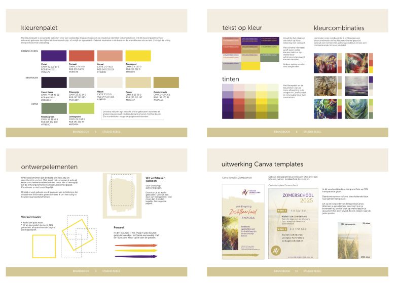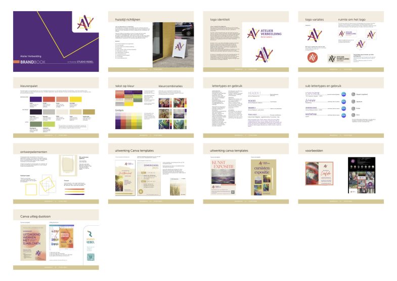 Als aanvulling op het logo heb ik een complete stijl ontworpen, een brandbook. Dit bevat richtlijnen voor het gebruik van het logo, een uitgebreid kleurpalet, lettertypes, ontwerp elementen en voorbeelden voor toepassingen. Hiermee kan Atelier Verbeelding de branding consistent doorvoeren in posters, aankondigingen, sociale-media-posts etc.